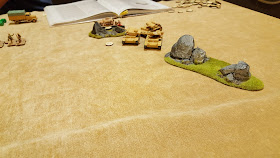 First up, to ease us into the game, we tried one of the scenarios from the book, "The Buffs Last Stand". The scenario sees a platoon of British infantry, supported by 2pdrs and 25lbrs (both on and off table), dug in on a slight rise in the desert. They face off against a DAK force with 2 PzIII platoons with PzIV support, an infantry platoon and off table medium and heavy artillery.